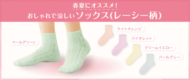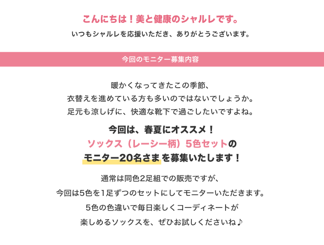 今回は5色を1足ずつのセットにして、ソックス(レーシー柄)のモニター20名さまを募集いたします。