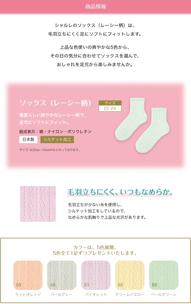 毛羽立ちにくく足にフィットする、春夏におすすめのシャルレのソックス(レーシー柄)5色セット。爽やかな5色の色違いで、毎日のコーディネートを足元から楽しめるソックスに。