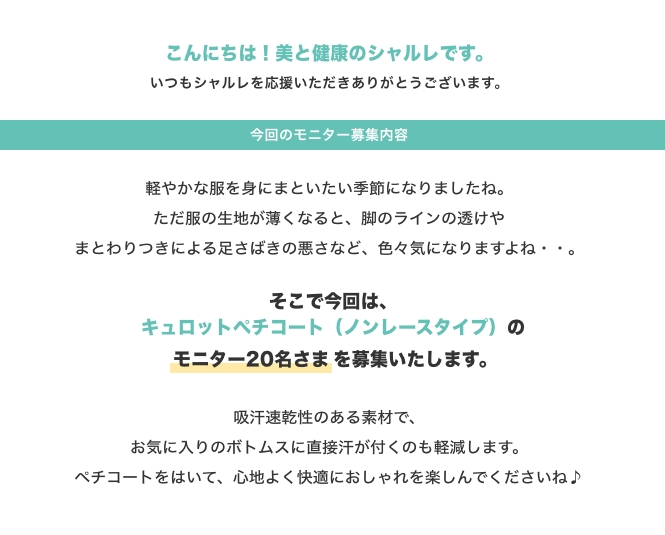 今回はこのキュロットペチコート(ノンレースタイプ)のモニター20名さまを募集します。