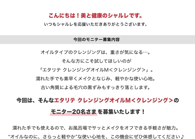 今回は、そんなエタリテ クレンジングオイルM<クレンジング>のモニター20名さまを募集します。