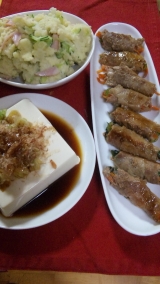 今日のメニューゎ… ★豚肉の野菜巻き ★ポテトサラダ ★冷奴 豚肉の野菜巻きは、チョーコー醤油さんのえびつゆを使いました 豚肉のスライスの上に、今日は人参にらピーマンを切ったものをのせて巻いて、チョーコー醤油さんのえびつゆにすりおろしたにんにくを混ぜたものに1015分漬け込んて焼きま… 2010/07/15