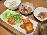 ※10月24日の晩ごはん 豆腐ハンバーグ 絹厚揚げのソテー イカと大根の煮つけ スパゲッティサラダ レンコンのきんぴら みそ汁 豆腐ハンバーグにはオーロラソースかけにして、絹厚揚げはごま油で焼いて焼肉のタレでいただきました 簡単に簡単 2012/10/25