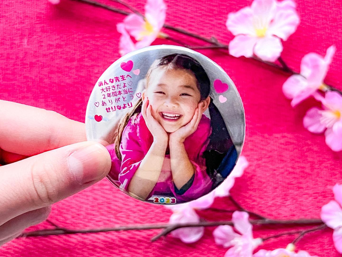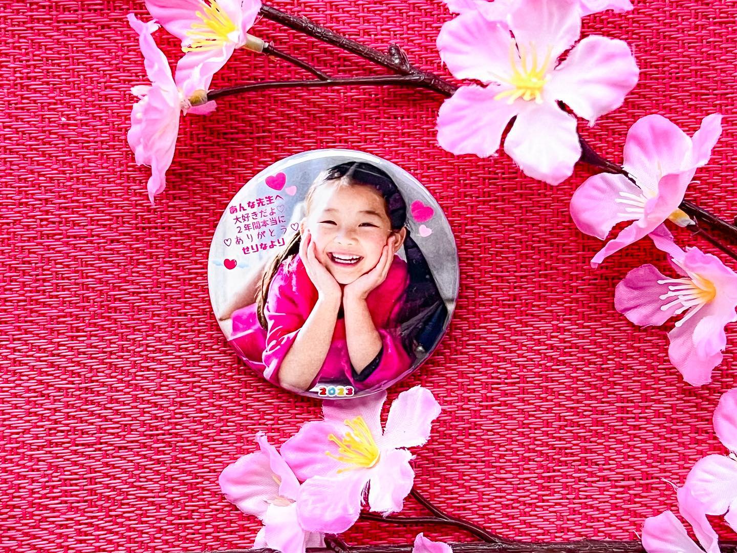 ♥️ u0040minnano_badge みんなのバッジ様で作成した缶バッジ❤️ 2年間お世話になった担任の先生へプレゼントするよ🌸 文字やスタンプでアレンジ出来るから、好みの缶バッジが簡単に作れちゃう💕 喜んでくれるといいなぁ💓🥰 #PR #コスモメディアサービス #みんなのバッジ #缶バッジ #マグネット #DIY #オリジナル缶バッジ #フィンガーグリップ #monipla #cms_fan