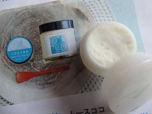 「コディナ バタームースココ」 お風呂上がりのケアに使ってみました (顔、唇、睫毛、ネイル ハンド) スパチュラで取る時にシアバターの少しぼそぼそっとするような感じはありますが(空気を多く含む為かな…)、手に乗せるとふわふわっとした感触、直ぐにとろっととろけて、商品説明にある… 2016/04/30