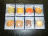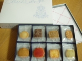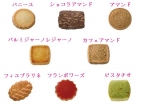 パルミジャーノレジャーノ4個、アマンド4個、フランボワーズ4個、カフェアマンド4個、ピスタチオ4個、フィユプラリネ5個、バニーユ4個、ショコラアマンド4個