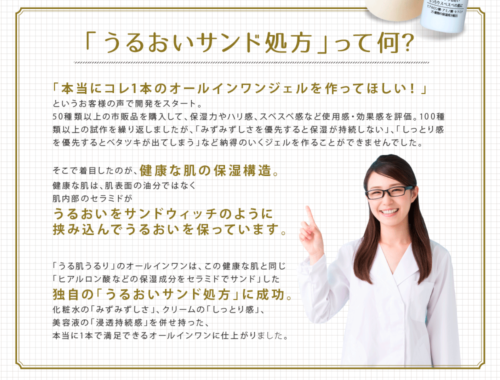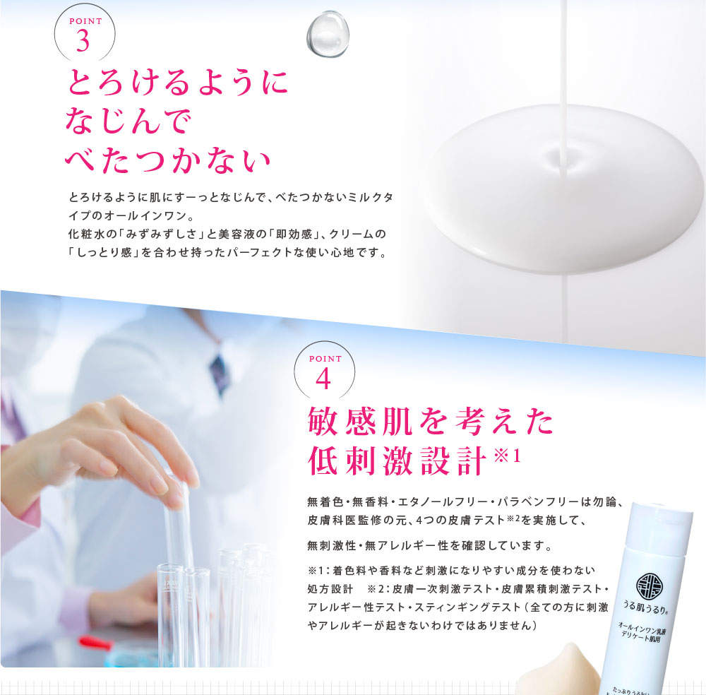化粧水の「みずみずしさ」と美容液の「即効感」、クリームの「しっとり感」を合わせ持ったパーフェクトな使い心地です。
