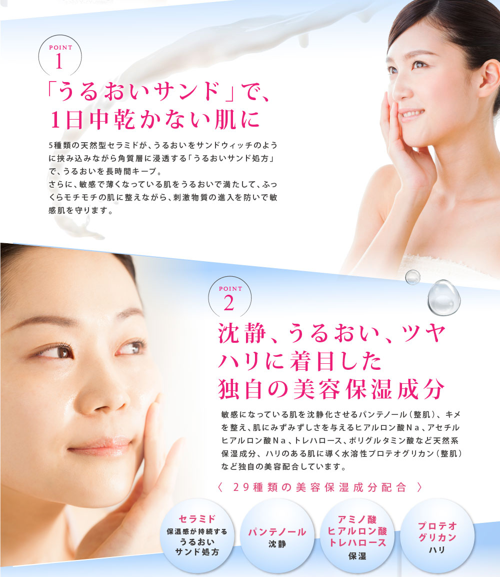 敏感になっている肌を沈静化させるパンテノール(整肌)、キメを整え、肌にみずみずしさを与えるヒアルロン酸Na、アセチルヒアルロン酸Na、トレハロースなどの保湿成分、ハリのある肌に導く水溶性プロテオグリカン(整肌)など独自の美容成分をたっぷり配合。