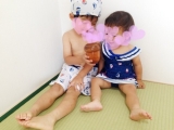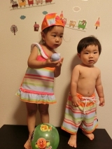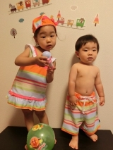 お揃い子供服を展開しているcorva(コルヴァ)様より2015夏の新作水着を頂きましたー!ヨット柄の可愛い水着!むてきち用に男の子用と、お揃いの女の子verも♪うちはまだ兄弟、姉妹いないので、お友達とおっそろ♪お菓子与えないとじっとしとかない子が1人いるので、写真がぶれて撮影が大変だった↓笑頂いた… 2015/07/17