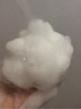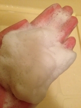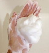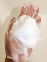 軽くお肌全体をぬらした後、石けんに水またはぬるま湯を加え、手のひらでよく泡立てます。