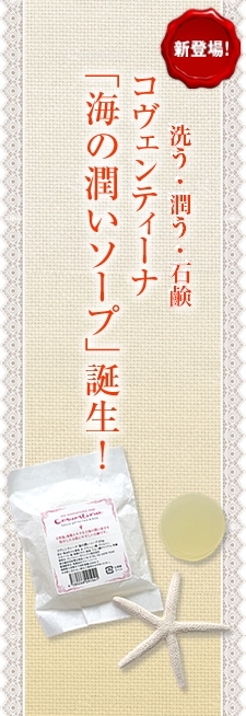 長期モニターをさせていただいていた、あのマッサージソルトのコヴェンティーナレポは>>>コチラ!そのコヴェンティーナの洗顔石鹸「海の潤いソープ」を発売前に使わせていただいています 2009/08/04