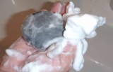 (2)泡立てた泡で顔を包み込み、ゴシゴシこすらないで優しく洗顔します。