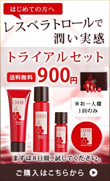 ワインポリフェノールの女王である「レスベラトロール」を配合した化粧品「CRERE」シリーズを販売しております。お客様のお肌にうるおい・ハリ・ツヤをお届けします。