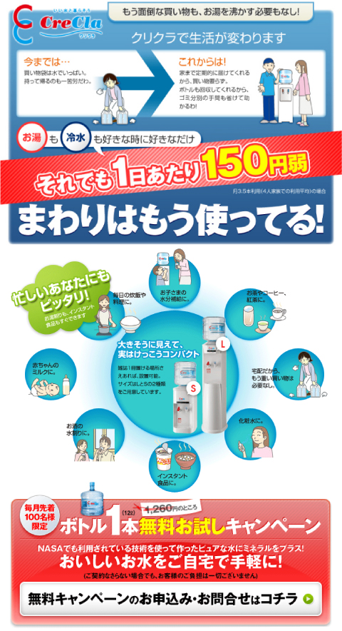 ウォーターサーバーのレンタル無料、おいしいお水の宅配サービスならCreCla(クリクラ)。ミネラルバランスに優れたおいしいお水を全国に宅配します。