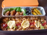 今日のお弁当 オムライス(あいびきミンチ玉ねぎにんじんピーマン) コンソメ酒ケチャップ塩コショウ からあげひじき焼きかぼちゃ オムライスの具を 前の晩に作っておいて 朝、ご飯と炒めるだけ♪ 焼きかぼちゃは、 焼くだけで おいしい 調味料は なるべく使わ… 2011/09/14