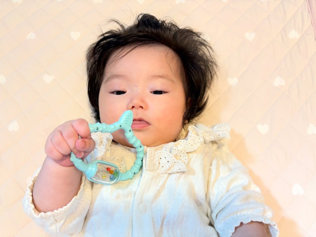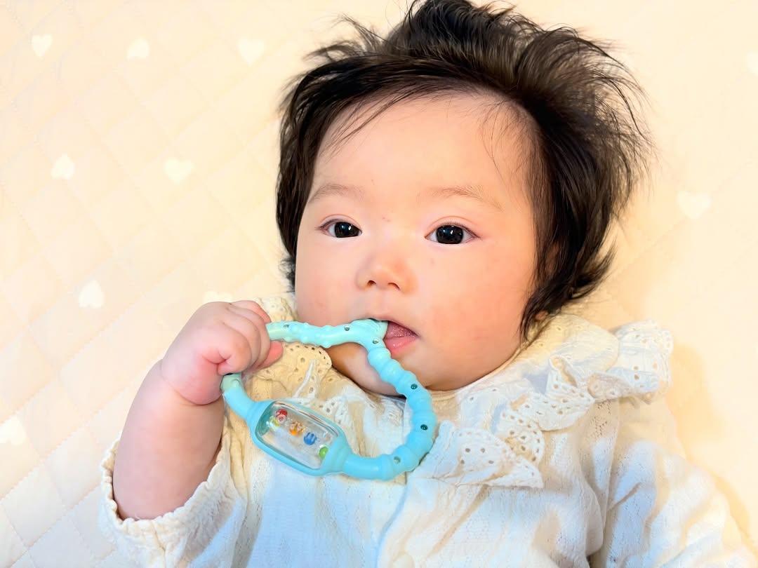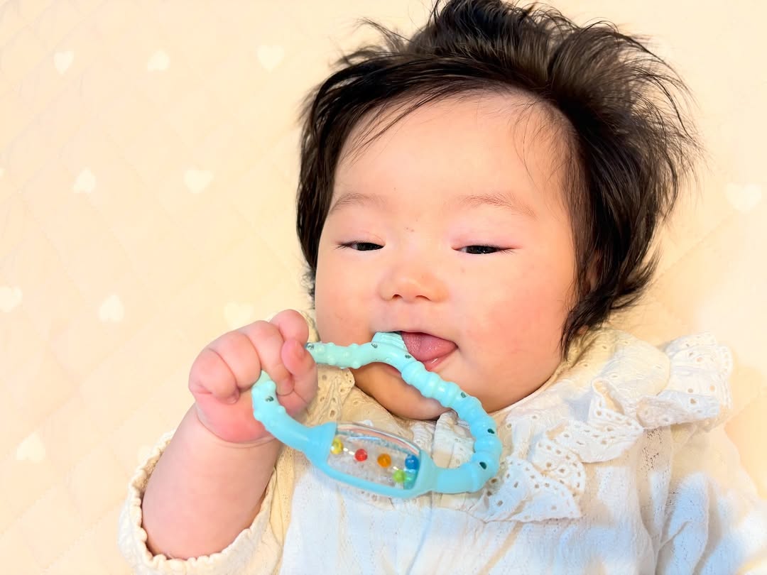 歯の生え始めなのか最近お口ブーブーしてるはるひちゃんに初めての歯固め✨