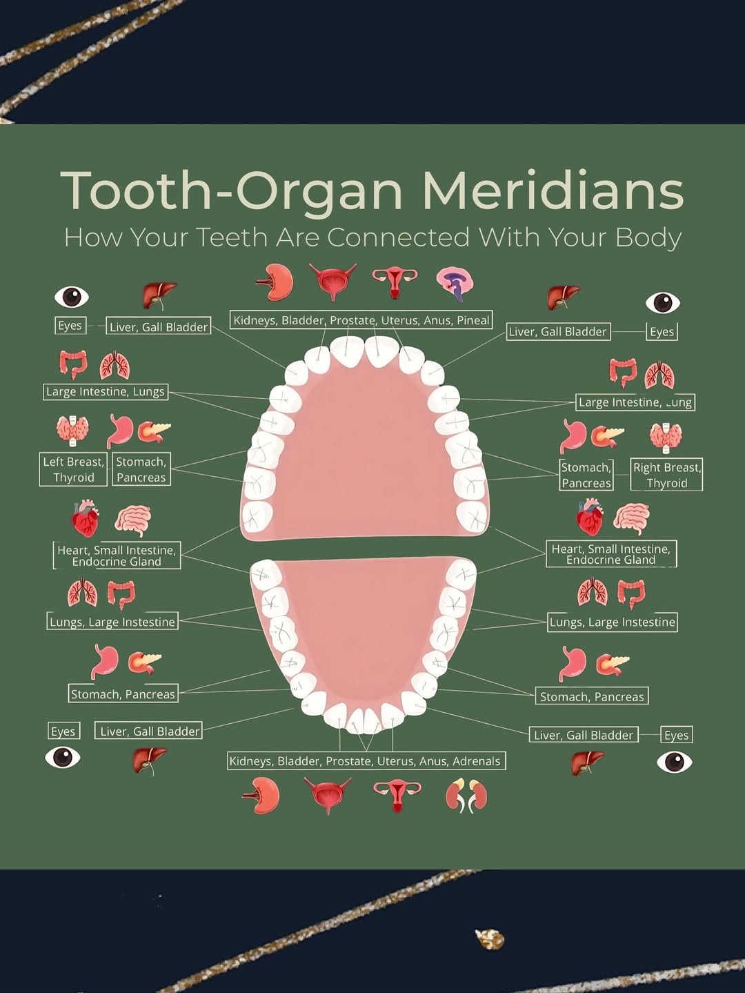 🦷Teeth and organs are connected via meridians. If teeth have dental problems, the corresponding organs can also be affected- may lead to various health problems.