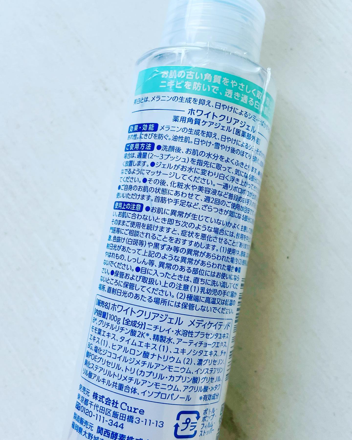❄️ Cure ホワイトクリアジェル 美白対策&ニキビ予防に効果的な薬用角質ケアジェル✨ 毎日スキンケアしていても、 汚れたお肌に色々つけても意味ない🤦♀️ なのでまずしっかり落とすことが大切なんだね👏 このホワイトクリアジェルは 古い角質や皮脂汚れをやさしく絡めとってくれるよ☺️ テクスチャーはぷるっとしたジェル状でかなり柔らかい 『薬用』のホワイトクリアジェルだから なんと約90%がお水でできているよ🙄✨ お顔に使うものだから、お肌にやさしいのが嬉しい💕 まずはしっかり洗顔して、お肌の水分をふき取る そしてホワイトクリアジェルを 顔全体になじませたら1分程度放置 すぐ触らないことで有効成分がしっかりお肌に届くよ♪ 水が浮き上がってきたら、こすらないように やさしく30秒間マッサージをして、 水がぬるま湯できれいに洗い流すだけ👍 あとはいつも通りのスキンケアをして終わり⭐️ 古い角質を優しく除去してくれるから、 もちっと生まれ変わったようなお肌になる😌 化粧水とかもいつもより馴染みやすいから しっかりとハンドプレスして使ったよ😉 これから紫外線の強い季節だし、 シミ、そばかすの生成を防いでくれるのがありがたい 特に汗とかで皮脂が酸化して 最近お肌の調子が悪かったからなぁ😭 お肌の状況をその都度確認して、 週2回程度を目安に使ってね😉 全身にも使えるみたいだから、 肘やかかととか、角質が気になるところにも使ってる🎶 ピーリングが苦手なんだよな。。って方も お肌に優しい成分のこのホワイトクリアジェルは ぜひ試して欲しい🙂💓 #ホワイトクリアジェル #cure #キュア #ピーリング #角質ケア #ニキビケア #保湿ケア #マスクニキビ #スキンケア #美白 #ピーリングジェル #プチプラ #マスク荒れ対策 #薬用ピーリング #monipla #cure_fan