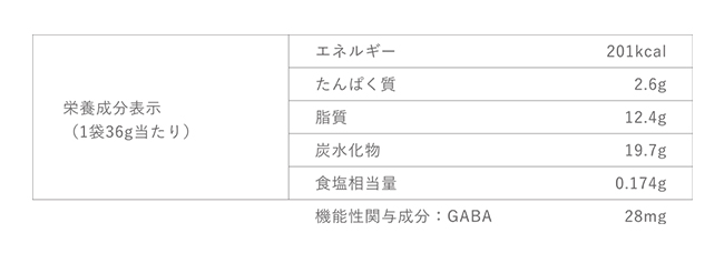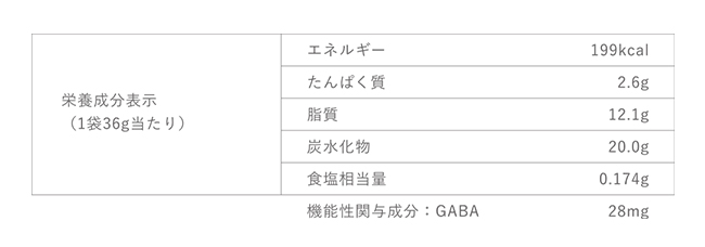 原材料名:乳等を主要原材料とする食品(食用植物油脂、食用精製加工油脂、発酵バター)〈国内製造〉、小麦粉、米粉、グラニュー糖、アーモンド、バラチノース、オレンジピール、カロブパウダー、豆乳、GABA、食塩/膨張剤、乳化剤