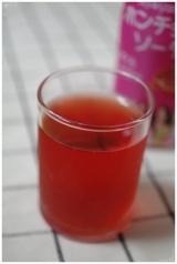 ☆原材料表示:調味酢(ざくろ酢、果糖ぶどう糖液糖、デキストリン、オリゴ糖)、果糖ぶどう糖液糖、着色料(ラック、アントシアニン)、香料、酸化防止剤(酵素処理ルチン)、酸味料、甘味料(ステビア)、ヒアルロン酸、(原材料の一部にりんごを含む)