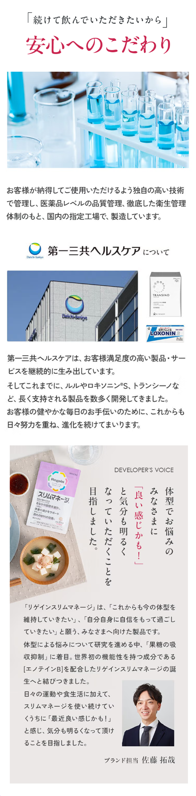 Regainスリムマネージは、第一三共ヘルスケアが果糖と脂肪の関係に着目して開発されたサプリメント。