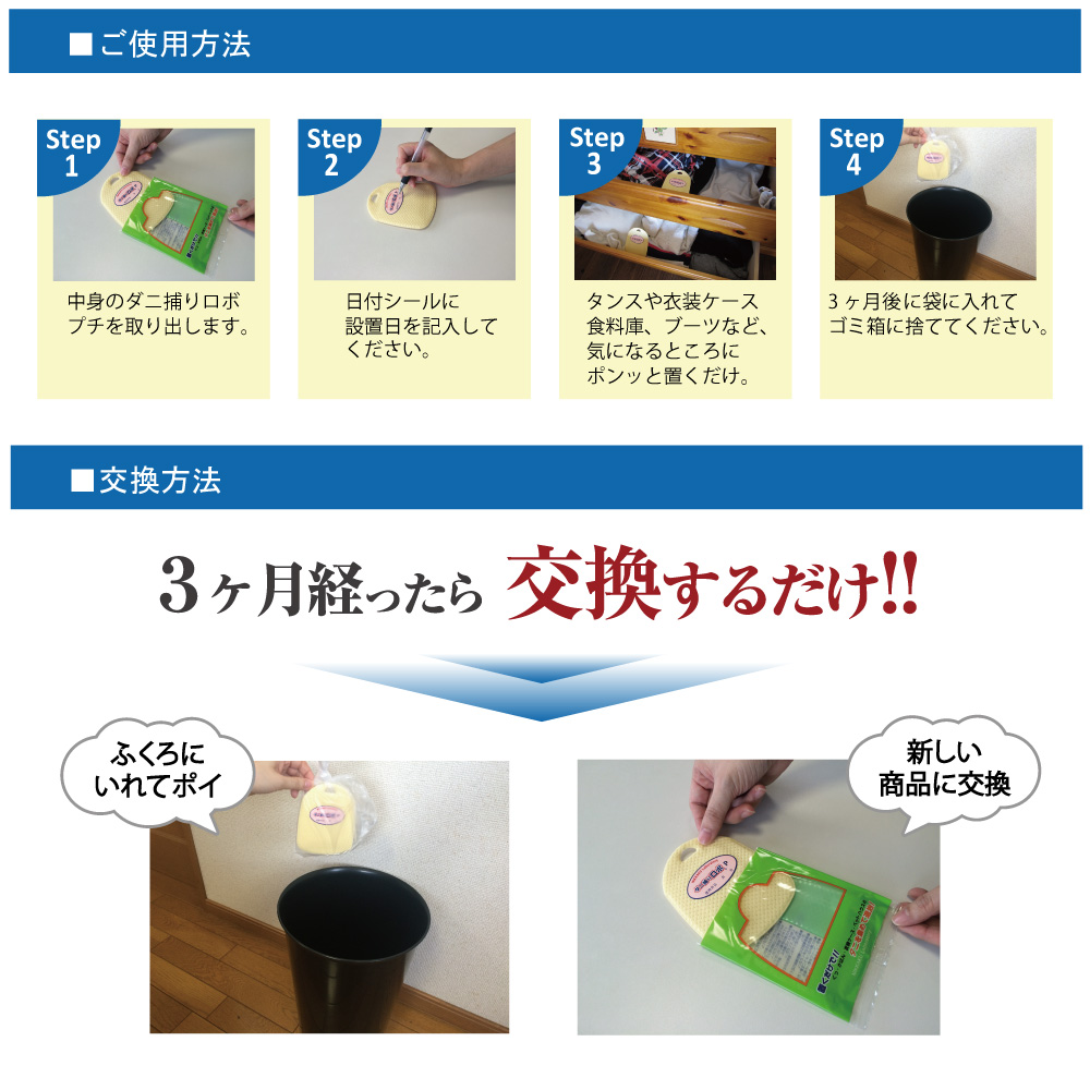 特長2:面倒な手間いらず! ダニがいそうな場所に置くだけで、潜んでいる屋内ダニを集めて捕獲します。処分の際も家庭用ゴミとしてそのまま処理できます。