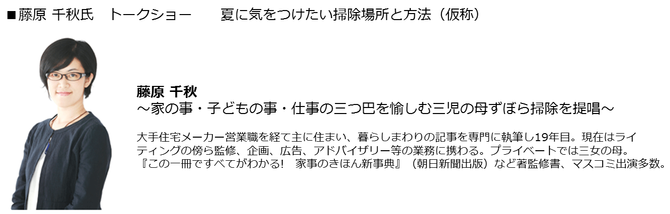 今回、「家事・お掃除」のアドバイザーとして多数のメディアに出演されている藤原千秋先生をゲストに迎えて、子育てに奮闘しているお母さん向けに、「ダニって何?」といった一般的な内容から「忙しいお母さんでもできるダニ対策」といった実用的な内容まで幅広くご紹介いたします。