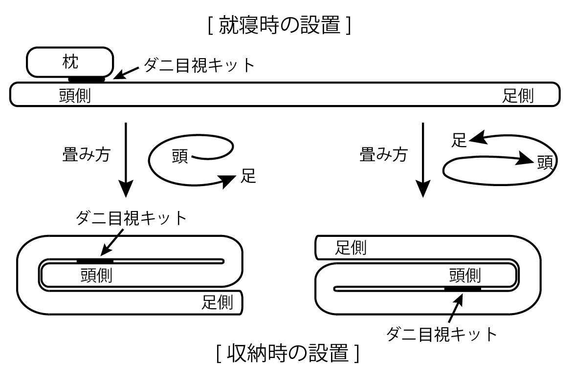 ■ダニ目視キット2個を、それぞれ「ベッド」と「敷布団」の枕元に1個ずつ設置