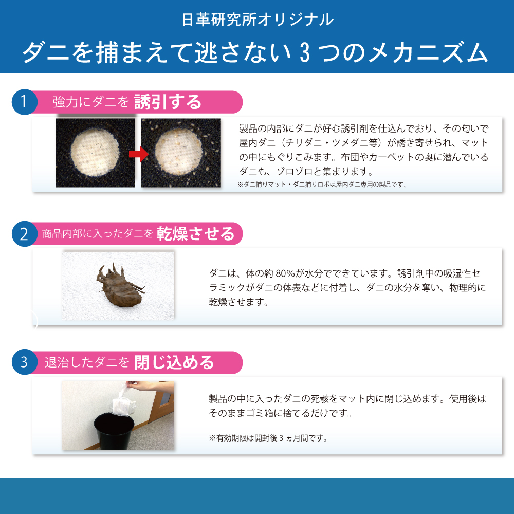 特長3:集めて退治! マットには誘引剤と乾燥剤が含まれており、誘引物質によって屋内ダニが集まり、乾燥物質によってダニは脱水状態になります。ダニを一網打尽にして退治します。