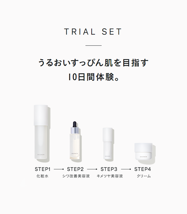 シワ改善美容液とキメツヤ美容液で10日間のシワ改善集中体験ができるディセンシア トライアルセットです。
