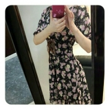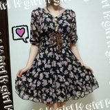 レースアップ花柄フレアワンピ ]
