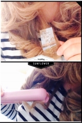 バッチリ決まった髪の毛束にシートをのせて、ヘアアイロンで挟み3~5秒ゆっくり熱していくと…
