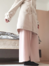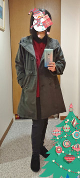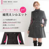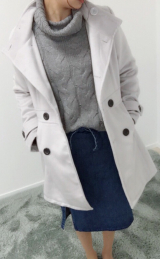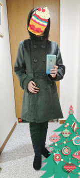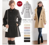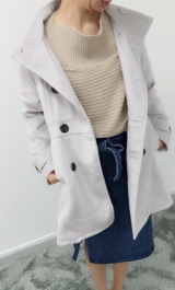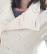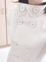 ダブルボタンが大人っぽく着こなせます。スタンドカラーの裏には裏ボタン付きしっかり立つようにしています。