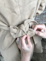 本体と同じ生地のベルトは、結びやすくするために中心は細く、先だけ太くなっているデザインで可愛いリボンが完成!