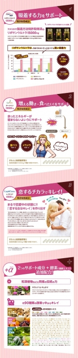 ダイエットサポートの特許成分の推奨量がきちんと摂取できる高配合の吸着系サプリメントです。「ガーシトリン:15,000mg」、「リポサンウルトラ:15,000mg」、「レプチコア:4,500mg」が毎日の食事からしっかり吸着して、あなたのダイエットをサポートします。