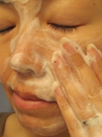 テカリ、黒ずみが気になるTゾーンなどを中心に、顔全体をやさしくマッサージするように洗顔し、その後水またはぬるま湯で洗い流してください。