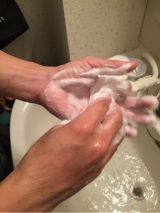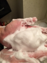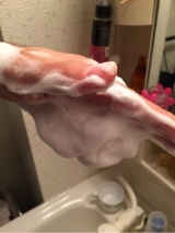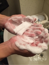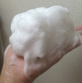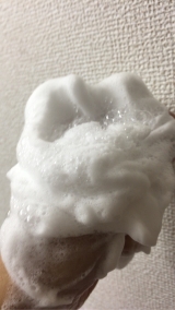 水またはぬるま湯で顔をぬらした後、100円玉大のパウダーをぬれた手に取り、少量の水またはぬるま湯を加えて、手と手をこすり合わせるようにして泡立てます。