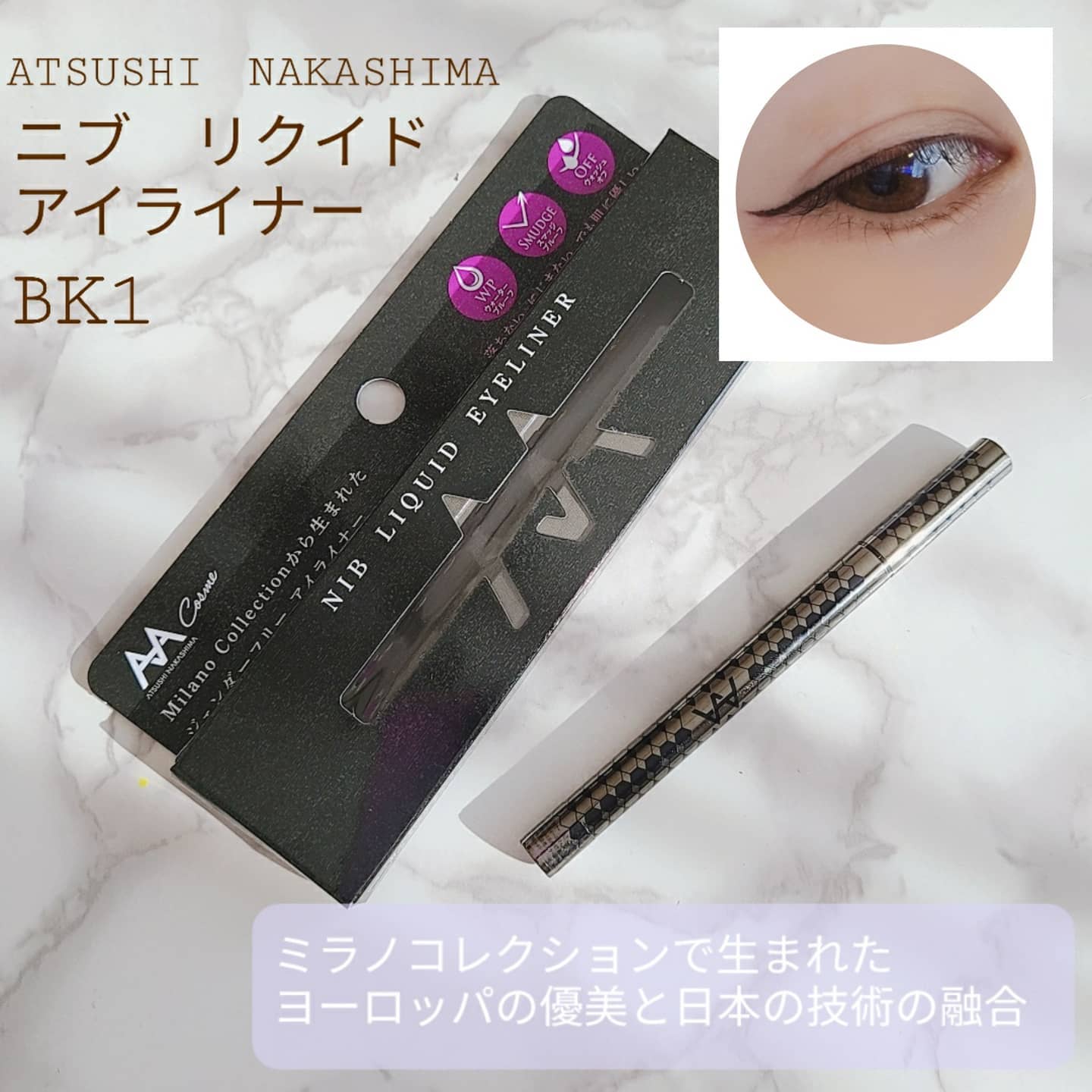 とにかく 落ちにくいアイライナーならコレ☝️ ATSUSHI NAKASHIMA ニブ リクイドアイライナー 細い線が書きやすい♪ にじみにくい、おちにくい♪ リキッドアイライナーが苦手、 初挑戦してみたい、 という方にはぜひオススメしたい😄 動画で紹介したように、 クレンジングでどれだけ擦っても落ちない😂 お湯で落とすことを推奨されてるようなので、ゴシゴシしないよう気をつけてね! でもこれって、雨の日、プールや海はもちろん、滝汗かいても落ちないってことでしょう😆🤘 さすが、ミラノコレクションで生まれたアイライナー✐ 原産地明確で安心… 愛媛産天然マテラ鉱石配合らしい ジェンダーフリーコスメ クールな印象のデザインになってます💫 #aacosme #アイライナー #ATSUSHINAKASHIMACosme #イースマイル #落ちない #にじまない #monipla #esmile_fan