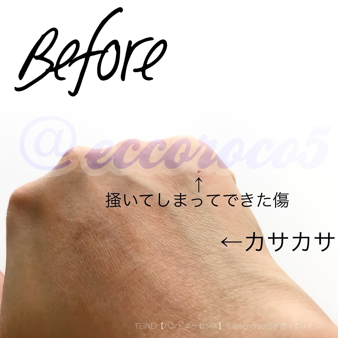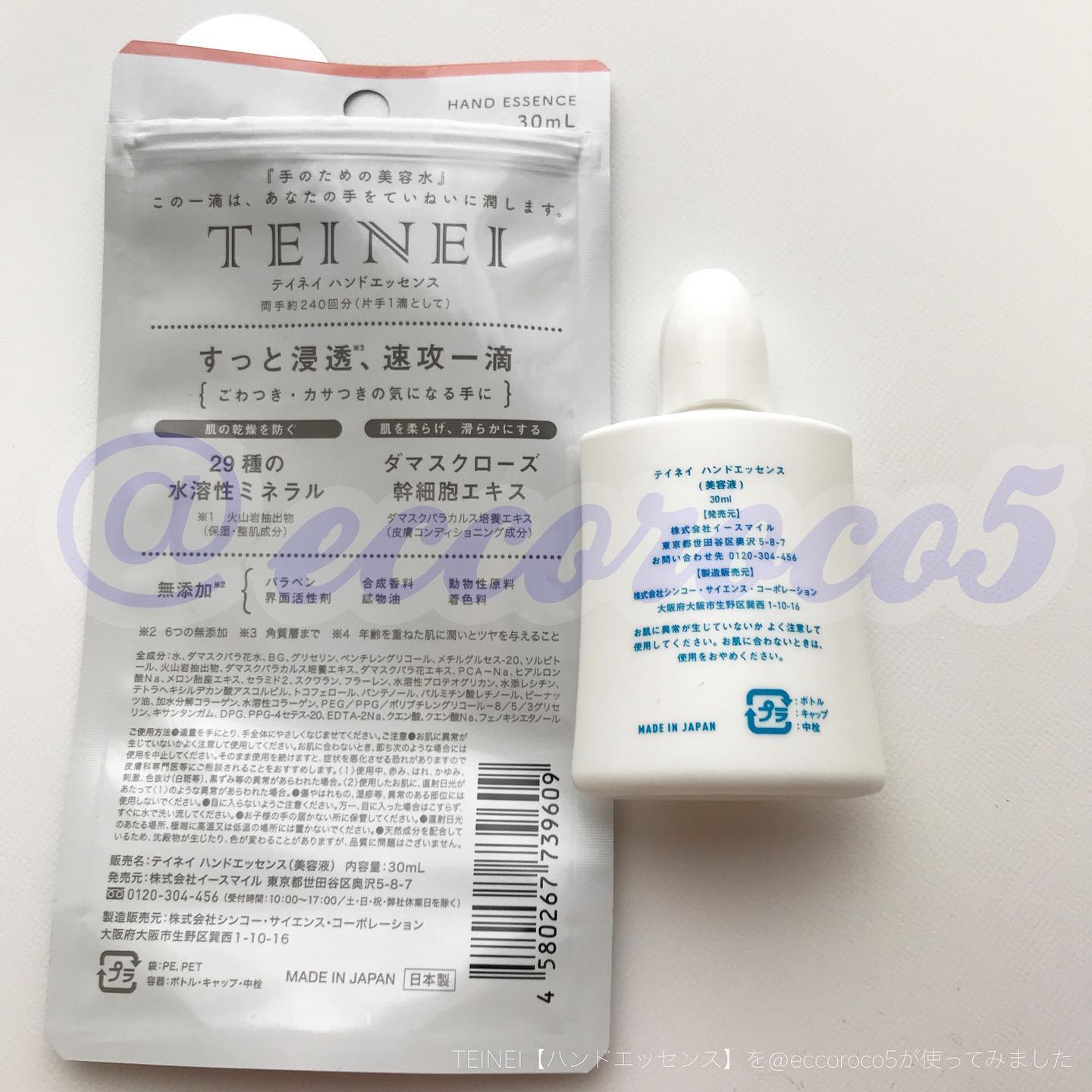💁♀ TEINEI【ハンドエッセンス】を使ってみました 🎈 🎥使用動画あり🎥 \塗ってすぐサラサラ!使い続けて効果◎/ ここ最近の一番のヒット商品⚾️✨ ▼ 👉【商品特長】 すっと浸透、速攻一滴💨手の美容水✋ アルコール消毒や乾燥で手荒れ、くすみ、しわ等手のトラブルを抱えている女性は8割以上⚡️ 手荒れや手のエイジングにお悩みのトラブル肌を、1ステップでしっとりやわらかに導く1滴💡 角質層にすっと潤いを届ける成分処方&良質な油分のバランス配合で潤ってしっとりやわらか⭐️ ・火山岩から抽出した水溶性ミネラル ・ヒアルロン酸などの美容成分 ・ナノサイズに凝縮したビタミン ・バリア機能を高め(セラミド)、潤いを守る(スクワラン) ・細胞そのものを変えるダマクスローズ幹細胞エキス ・パラベン、界面活性剤、合成香料、鉱物油、動物性原料、着色料フリーの安全性 美容水だから、手、指先のすみずみまですっと潤い、ずっと保湿🌈 この一滴はあなたの手をていねいに潤す✨ ▼ 👉【使ってみました】 最近、除菌を頻繁に行うせいか特にひどくなっているように感じる手の荒れ😢 手の甲が乾燥し、カサカサぶつぶつと湿疹ぽくなり✋ そんな時に出会った【ハンドエッセンス】✨ 片手に1滴だけでいいの?と思って出したらサラッサラのテクスチャでビックリ💨 サッパリした、本当にお水みたいな感覚🚰 香りもなく、手に伸ばすとほんのり化粧水のような成分由来の香りだけ👃 伸ばしたらすぐに吸収され、何事もなかったかのような手のサラサラさ💨💨 逆にこれで効果あるのか?🤔と疑ってしまったくらい🙈 それが使い続けて大納得🙌 1週間後には、きれいな手に✨ 一ヵ月以上、市販のクリームやハンドクリームで保湿を頑張っても治らなかった湿疹ともサヨナラ👋 さらに乾燥によって掻いてしまい、傷となっていた部分とも決別🔥 これはす・ご・い😍❤️ ハンドクリームのベタベタがなくなるまでおとなしくしてられない私🙋♀️🚫 この【ハンドエッセンス】なら、すぐにスマホを触ろうが、PCを触ろうが、ベタベタしないから自由自在💻📱 指先までサラリと伸ばして、キューティクルの保湿にも🪐 しかも1本で両手約240回分の高コスパ👛💕 もうハンドグリ―ムはいらないのではないだろうか…❗️ コンパクトなサイズなので、ポーチに入れてもよし👝 加えてシンプルなデザインなので、手を洗ってすぐ使えるように水周りに1本常備してもよし🚰 気になった時にすぐ使えるよにリビングに置いてもよし🛋 今のところ、3本は同時使いしたいくらい👍 手以外にも使用OKなので、ポーチに入れておいて、マスクを外した時に気になる口元のカサカサにも使用😷 商品をご紹介する動画や写真を撮る度に思う、自分の手の気に入らなさ✋⚡️ ふっくらツヤのある手指に憧れる☁️ 【ハンドエッセンス】を使い続けて、つやつやな手を目指したい🧚♀️ 使用開始直後の数日は効果を実感できなくても、ぜひ使い続けてほしい💙 とにかくオススメ👍👍👍 ▼ 👉 詳しくはブログ @eccoroco5 でご紹介中🙋♀️💕 ↑使い方のポイントもまとめてます✏️ (ここに載せてる写真以外も📸) 《商品詳細》---------------------- 《商品名》 ハンドエッセンス 《メーカー名》 イースマイル 《ブランド名》 TEINEI 《公式ショップ参考価格》 1,958円(税込) 《内容量》 30mL(両手約240回分) ----------------------------------- #TEINEI #ハンドエッセンス #手の美容水 #手荒れ解消 #monipla #esmile_fan #除菌の手荒れ #手の保湿 #サラサラ #美容水 #手荒れ