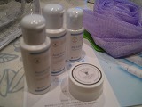 洗顔・化粧水・美容液・ジェル・泡立てネット・ポーチのセット。