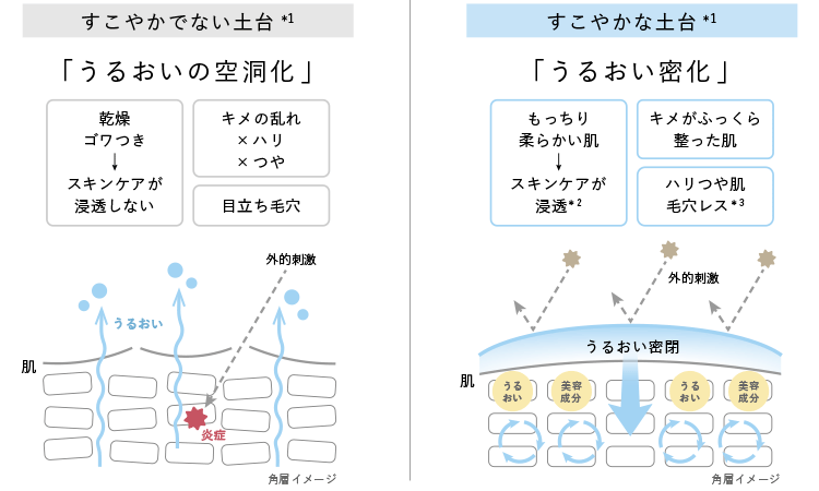 すこやかな土台*1を育むには、スキンケアによって肌のバリア機能をサポートする「うるおい密化」な肌に整えることが大切です。