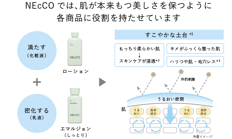 ローション(化粧液)で、肌をうるおいと美容成分で満たした後、エマルジョン(乳液)で蓋をすることで、うるおいが密化した、もっちり吸いつく、ハリつや肌へ。水分蒸散や外的刺激の浸入を防ぐ肌のバリア機能をサポートし、スキンケア効果を高めます。