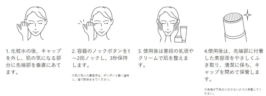気になる部分にニードルの先端を軽く押し当ててノックすることで美容液が角層内に注入され、ハリ・弾力を与えます。