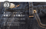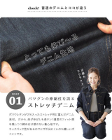 生地は程よい厚みの10オンスデニム。肉感を拾いすぎず、ストレッチ力もありますので、ごわごわ感、窮屈感を大幅に軽減し 初めて着た時から自然に身体に馴染む心地よい着心地を実現します。さらに、洗うことでより柔らかな風合いへと変化していくんです。しかも、デニム好きさんにも納得していただけるよう、ステッチやボタン部などのディテールにもこだわりました。
