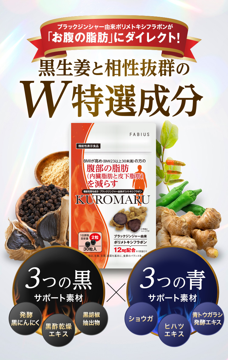黒丸に配合されるブラックジンジャー由来ポリメトキシフラボンは、日常生活におけるエネルギー代謝によって脂肪の消費を促進します。