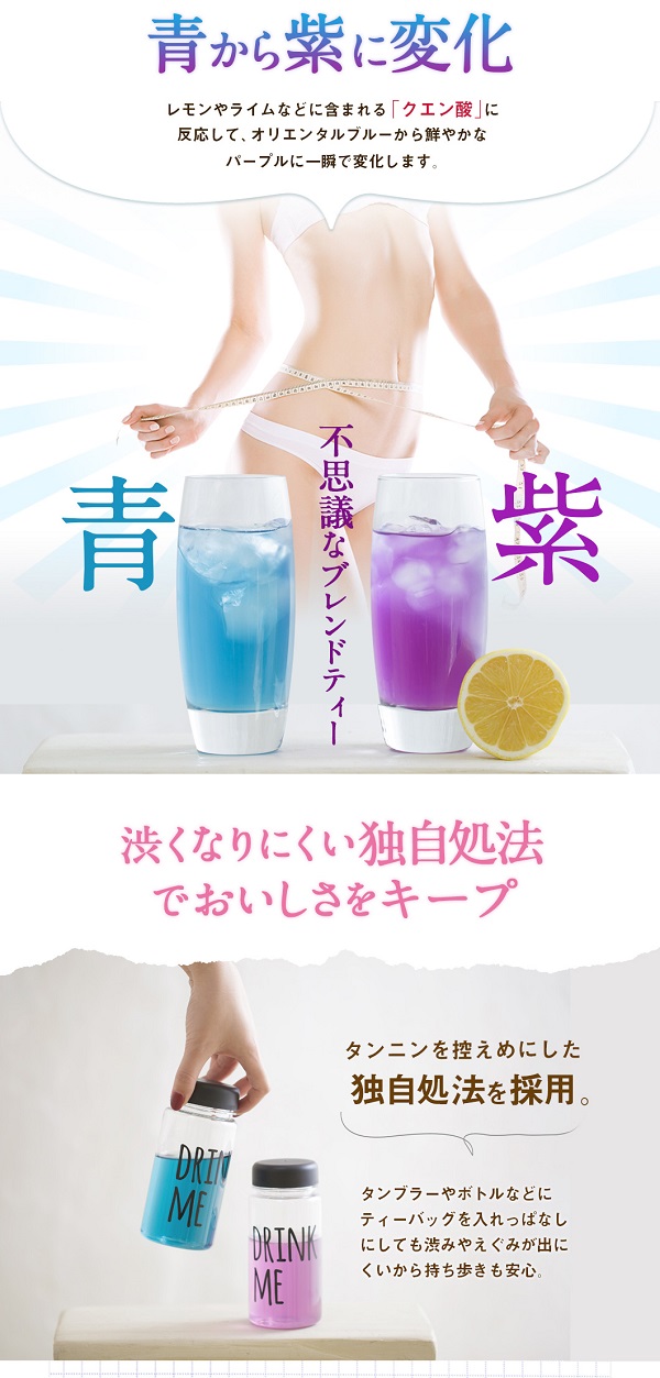 ココロとカラダを癒し、無理なくスリムボディへ♡ バタフライピーから出るオリエンタルブルーの水色(すいしょく)。 青は抑制効果を持ち、心を落ち着かせる色でもあるため、「リラックス」と「ダイエット」両方の効果に期待できます。 他にも健康効果にこだわって4種類のハーブをオリジナルブレンド。 日々のストレスの解消、そして、無理のないダイエットを応援します♪ レビュー数 : 44 |