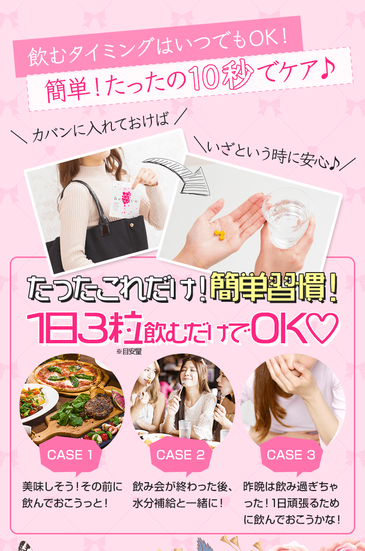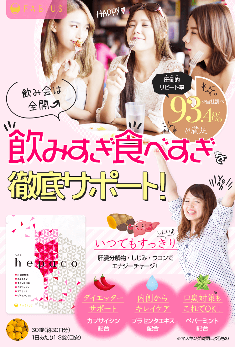 飲みすぎ食べ過ぎ徹底サポート! 女子の強い味方「へパコ」が登場☆ へパコには女子に嬉しい ダイエットサポート成分 美容成分 口臭カバー成分 をたっぷり配合! へパコで女子力を高めましょう♪ レビュー数 : 25 |