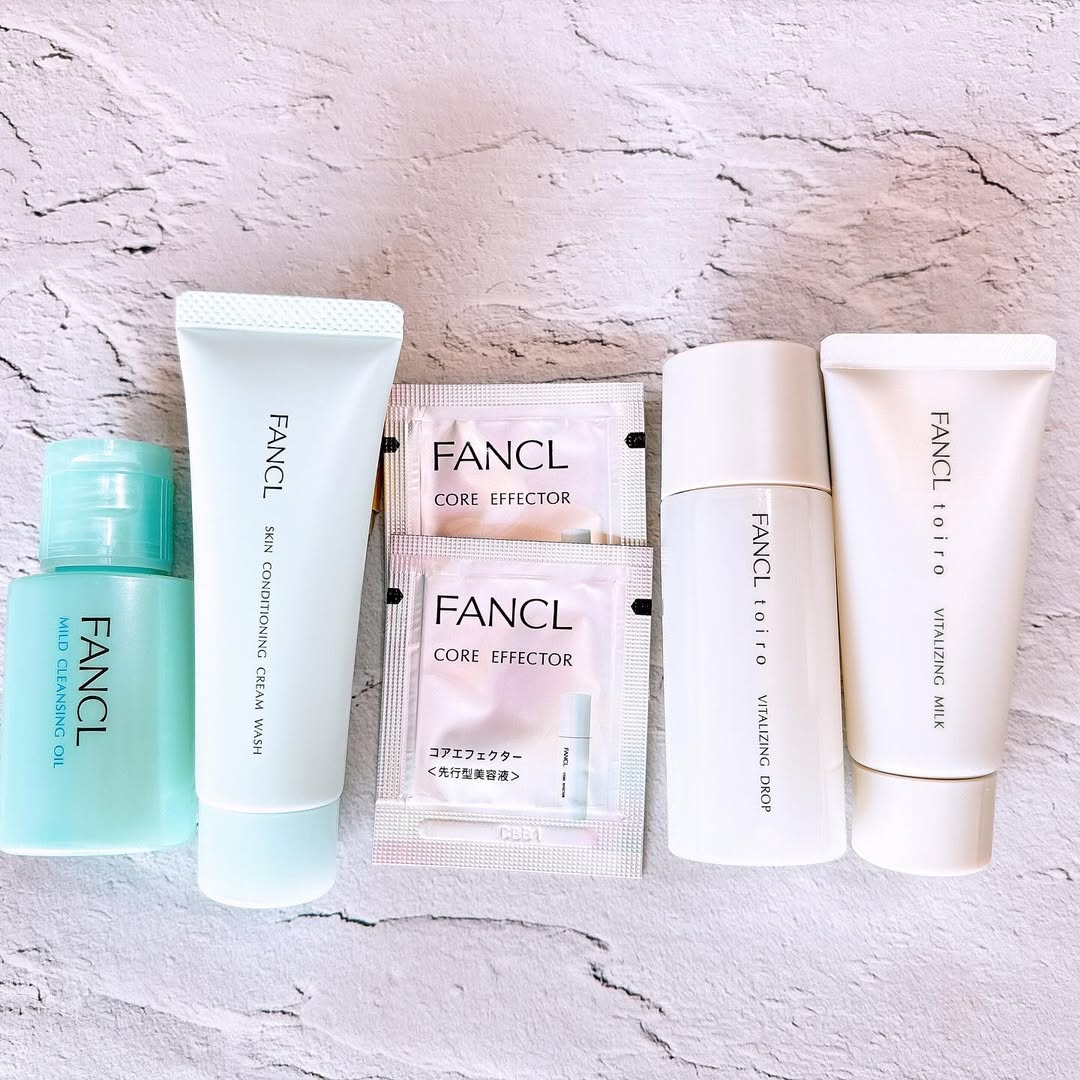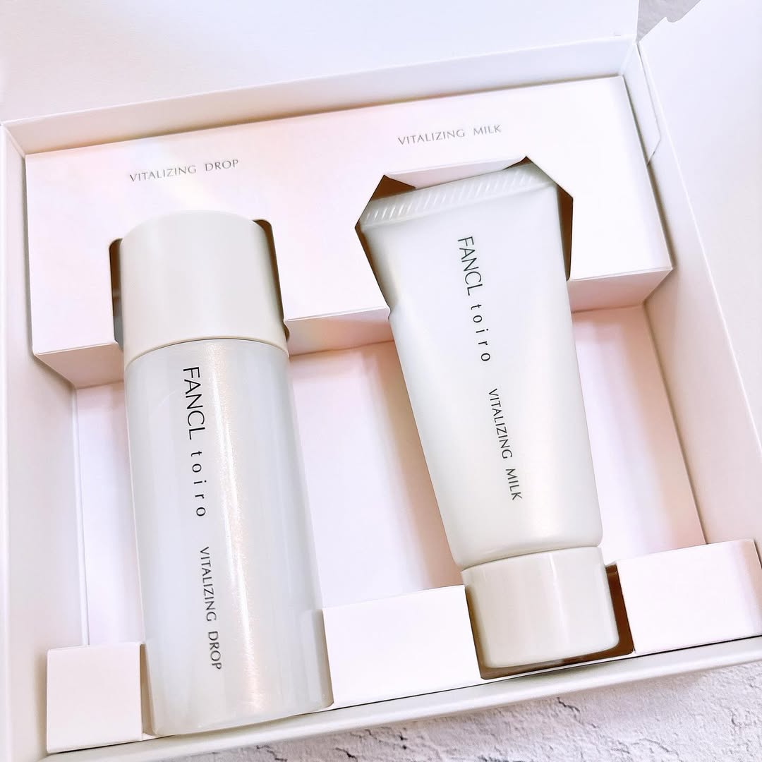 \無添加*コスメファンケル🆕アンチエイジングシリーズ-toiro-の豪華✨トライアルセット/ 50代にもなると、加齢悩みは複数の悩みが複雑に絡み合うようになってきちゃう😣。 私も、コラーゲン減少に伴うハリ・弾力の無さ、毛穴のたるみ、シミ、シワなどが年々悩みは増すばかり。 そして、子供の頃から肌のバリア機能の弱さから赤みが出やすい。 なので、ファンケルはこれまでも保湿ケア、アクネケア、美白**ケアなど様々なシリーズ、アイテムを使ってきた私。 無添加*コスメのファンケルからコラーゲンに着目した今回の新シリーズ『toiro VITALIZING トイロ バイタライジング』の化粧液、乳液が今の自分に合いそうだなと思い、興味があったよ。 届いたトライアルセットが、豪華✨で嬉しいサプライズ! 🕊️toiro バイタライジングトライアルセット🕊️ トイロ バイタライジングドロップ 30mL トイロ バイタライジングミルク 15g ➕ マイルドクレンジングオイル 20mL スキンコンディショニング洗顔ミニボトル 20g コアエフェクター1回分サシェ×2包 クレンジング➡️洗顔料➡️導入美容液➡️化粧液➡️乳液 とフルラインスキンケアで体験できるセットと豪華すぎるでしょう🤗 〜toiro2品について紹介〜 『バイタライジングドロップ』は微粒子化ハリオイル***が配合されている化粧液で、パシャパシャ系のみずみずしいテクスチャー。オイル入りローションのため薄く白濁しているよ。 みずみずしい軽やかなテクスチャーだけど、すぐに肌になじむというよりは、じんわりなじんでいくように感じる。そして肌内側からうるおいでふんわりと満ちて、肌表面には極薄の油膜で包まれるような塗り心地。1本で化粧水+美容液のような使い心地。 乳液『バイタライジングミルク』は、油分がたっぷりのこっくりと濃密なミルキークリーム状 のテクスチャー。 塗り心地はまるでクリームを塗ったようにもちもちむっちりな塗り心地。こちらも1本で乳液+クリームの使い心地。 敏感肌でも積極的に攻めのエイジングケア****できるなって感じたよ。 * ファンケルの「無添加化粧品」は、防腐剤・殺菌剤・合成香料・合成色素・石油系界面活性剤・紫外線吸収剤を一切使っていません。 ** メラニンの生成を抑制して、シミ、そばかすを防ぐ ***部分水添ホホバ油、ラウロイルグルタミン酸ジ(フィトステリル・オクチルドデシル)[エモリエント] **** 年齢に応じたお手入れのこと #PR #株式会社ファンケル #fancl #toiro #toiroバイタライジング #monipla #fancl_fan