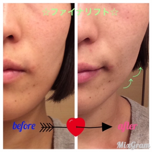 口角や頬がピンとあがり、ハリのある肌に近づいていますたるんでいたフェイスラインが明らかにリフトアップ目じりや眉間のシワが薄くなっていることも感じました肌のトーンが明るくなった感じがしました塗る前は、少しごわつき、乾燥気味だったのに、ファイナリフトにしっかりと保湿され、包まれているような感じで… 2016/07/22