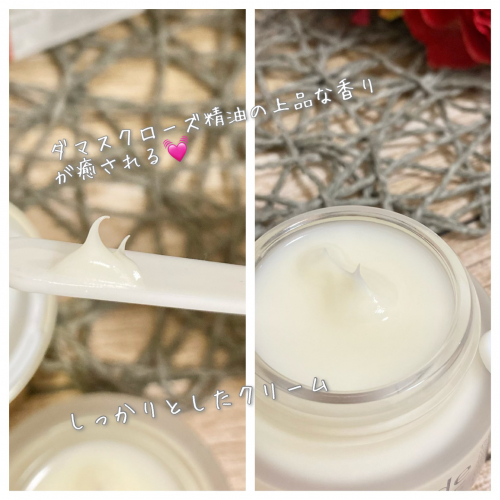 しっかり保湿されているのにベタつく感じはないし、肌がしっとりふっくらしたような気がします 保湿力が高そうなこっくり系クリームなのに、重たい感じもなく、凄く伸びが良くて、少量でも顔全体に馴染ませることが出来てコスパがいいのも嬉しい点でした! そして、ダマスクローズの香りが凄く良い…! … 2021/09/16