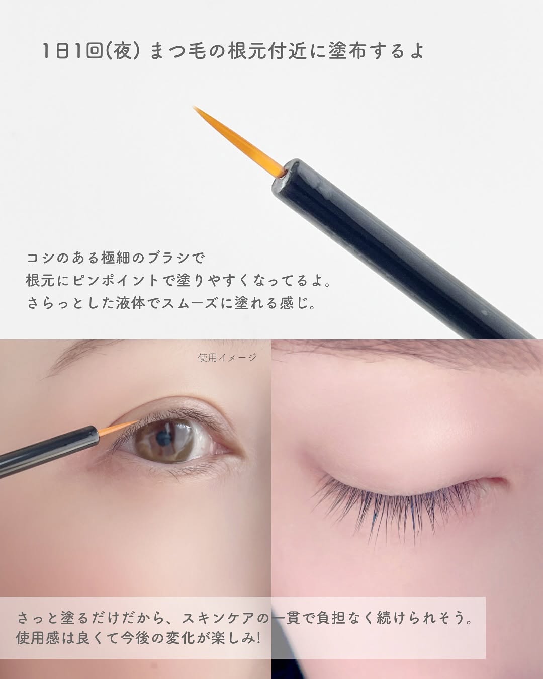 1日1回(夜)に、アイラインを引くように上まつ毛の根元付近に塗布するよ。